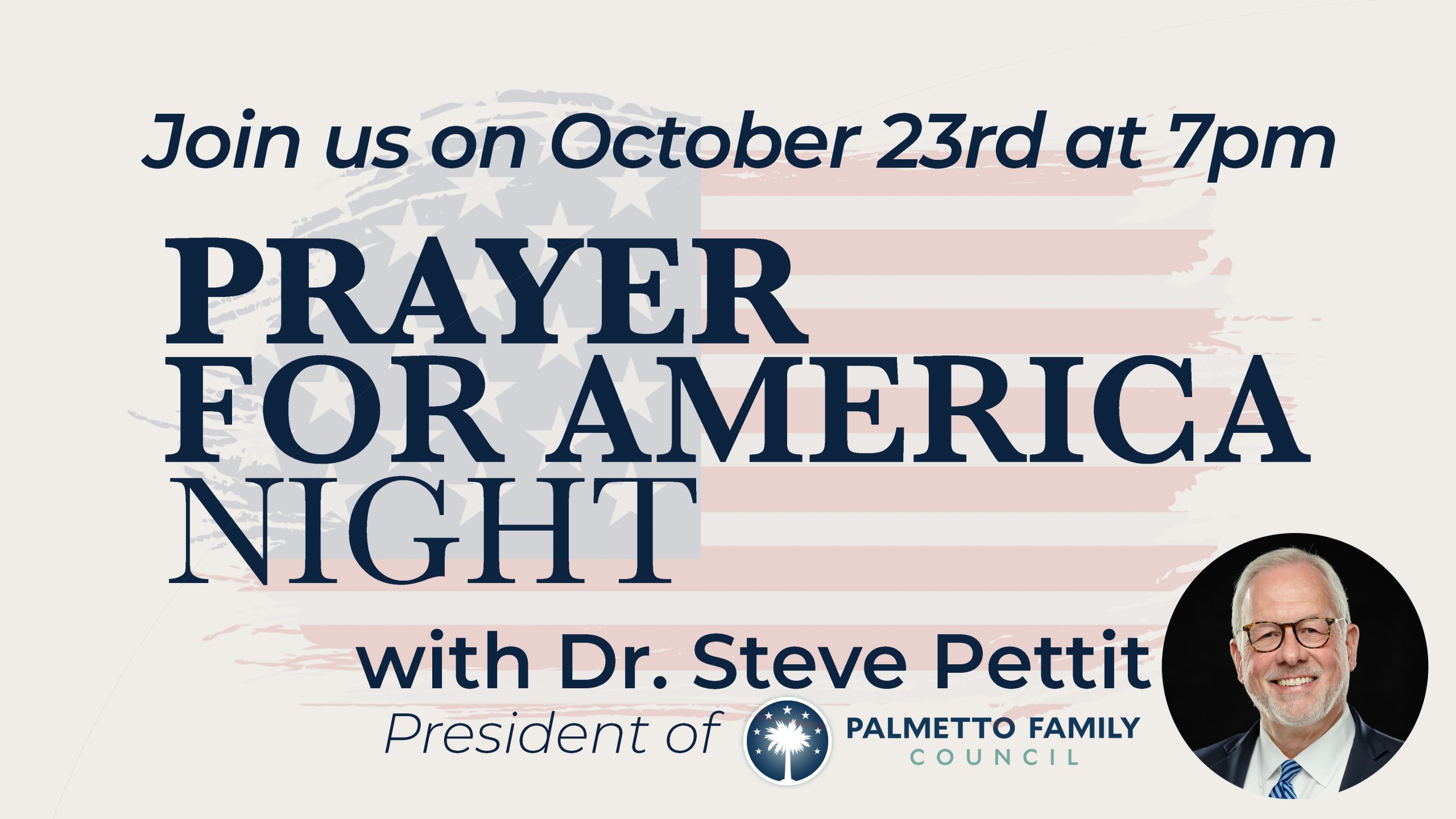 You’re invited to join us as we pray for our country on Wednesday, October 23. This evening will be led by Dr. Steve Pettit, the president of Palmetto Family Council. If you’d like to find out more about the work that this organization is doing in defending families, faith, & freedoms in our state, check out this link: https://www.palmettofamily.org.