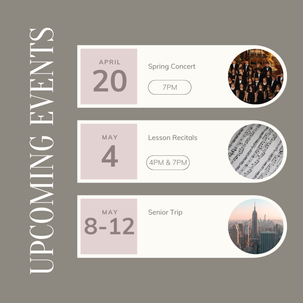 Piano and instrumental private lesson recitals will be held at 4pm and 7pm on Thursday, May 4, in the Shumpert Chapel.