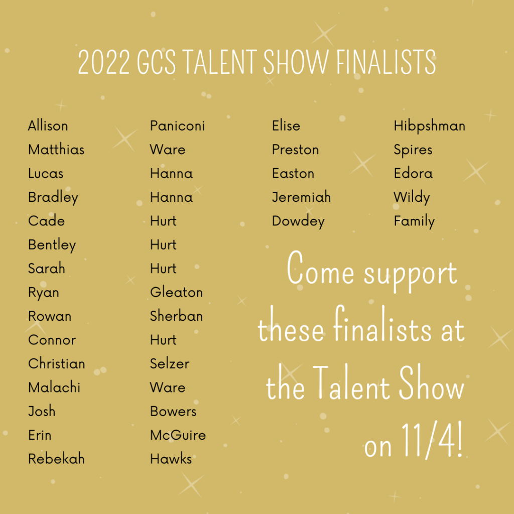 Tickets for the talent show are $6 each. Tickets will be sold in the office. We have 280 tickets. Once they are gone we will not be printing any more. Make sure to get yours before they’re gone! Each talent show contestant will receive one ticket for free.