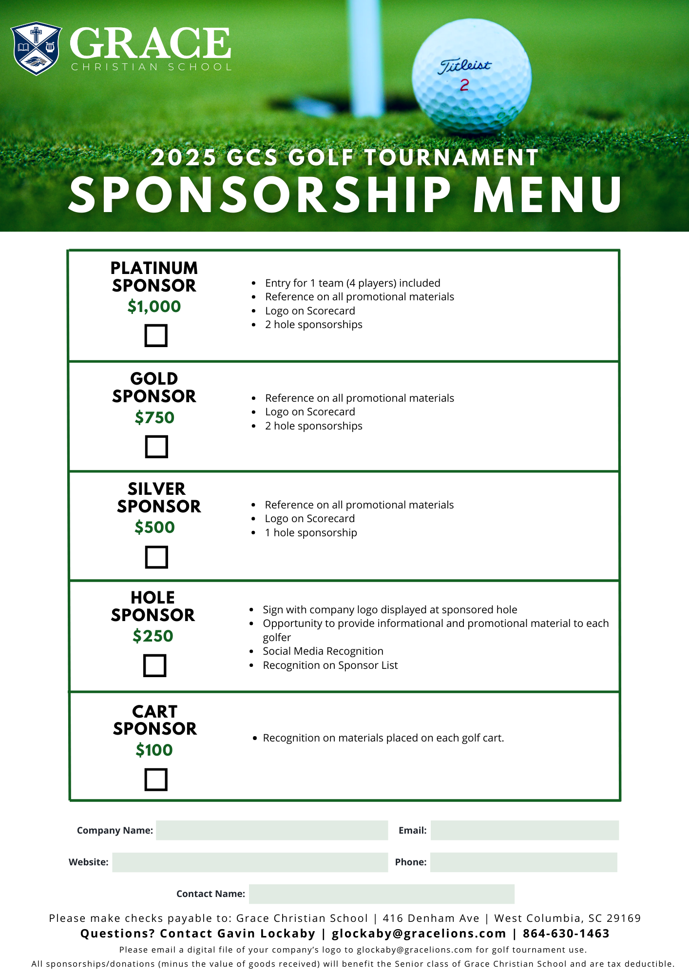 We are thrilled to announce the 2025 Annual GCS Golf Tournament. This year’s tournament will be hosted by the Junior and Senior Classes of Grace Christian School, and all proceeds will go to fund the Jr/Sr banquet as well as the Senior Trip. We have attached a document containing information about available sponsorships as well as a flyer with more information about the tournament. You may also use this link to register to participate in the tournament. Would you please consider sponsoring this year’s tournament? We would also love for you to register to participate in the tournament! Participants always have a great time!