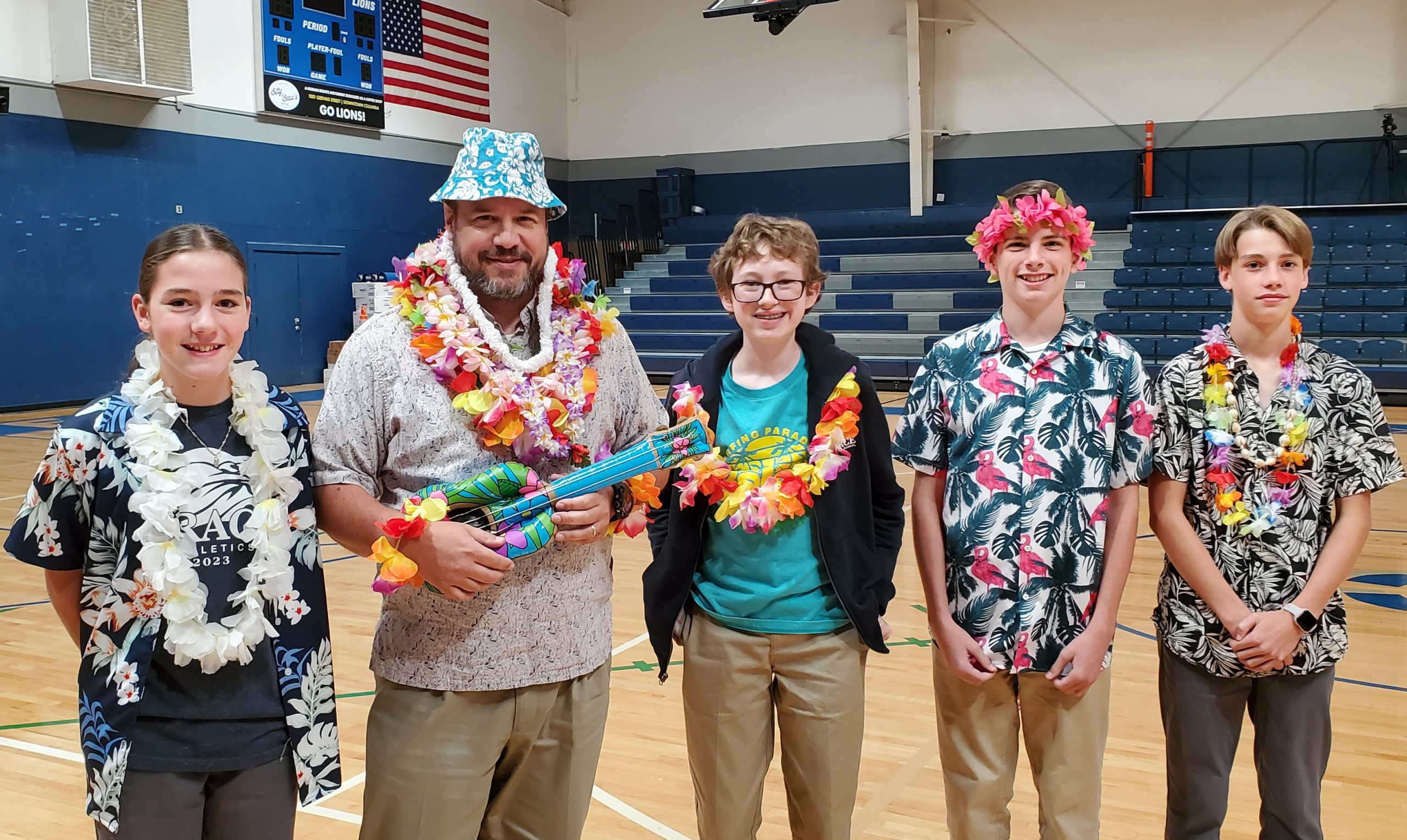 Congratulations to the 4th grade (Elementary) and 8th grade (Middle & High School) in placing first place in the Booster Club fundraising contest. Mr. Bushy was the “winner” of Dress your Teacher Hawaiian by a narrow 109 votes. Both classes will enjoy their pizza party next week. The Booster Club and our athletes appreciate your support during this contest!