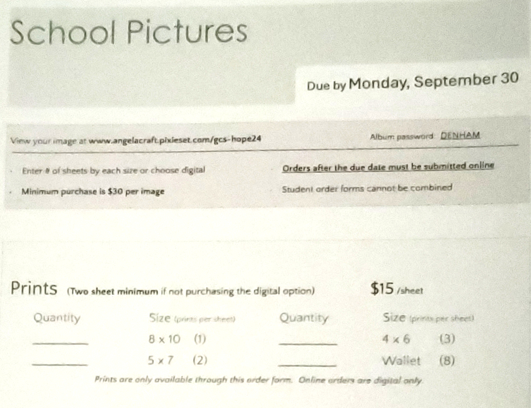 Picture order forms were sent home today with every student in K3 – 11. Instructions are in the form for viewing your child’s picture online. If you want a retake, please email Miss Ward at dward@gracelions.com by September 30. Retakes will be taken on October 1. When sending in an order, you must include cash or check made payable to Angela Craft.